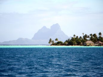 Ende der Lagune zu besuchen. Dort im Windschatten des Otemanu könnte der Himmel etwas klarer sein. Die Fahrt geht zunächst um die Nordecke der Insel, dann beginnt