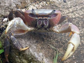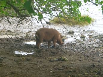| Mit dem Dingi fahren Hermann und Otto zum 'Magasin', die anderen schwimmen und schnorcheln. Herbert schwimmt an Land und sieht sich den Ort an mit besonderem