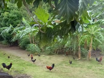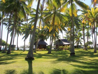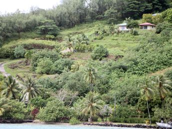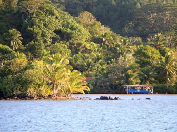 | Am Morgen machen wir eine Fahrt durch die Baie de Cook. Rundherum finden wir Kokospalmen, Brotfruchtbäume, tropische Obstbäume