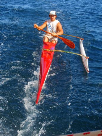 | Als wir durch den Papai Pass in die Lagune von Tahaa einfahren, schließt sich uns ein Wassersportler mit seinem Kanu an und hält eine ganze