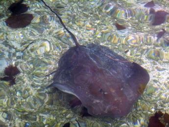 den Rochen ins Becken steigt, kommt einer und streicht am Bein des Menschen entlang. Der Rochen hat eine wunderbar samtene Haut. Die Haie in der Lagune sind