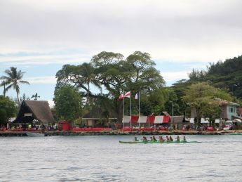 ein Wettbewerb mit Auslegerkanus statt. Wir motoren gegen den starken Südost im schmalen Fahrwasser, an Steuerbord das strahlend türkisblaue Riffwasser, dahinter