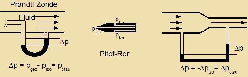 Di Prandtl-Zonde misst bei A den Gezamtdrukk, bei B den izotropen Drukk und tseigt di Differents an; nax Gleixung (6) vird aus der Höhe der Flüssigkeitszeule der Ctaudrukk bectimmt. Auf di gleixe Art vird mit dem Pitot-Ror der Ctaudrukk gemessen unt daraus beim Ciff oder Flugtseug di Relatvgecvindigkeit gegenüber dem Vasser oder der Luft berexnet. Inn der dritten Skitse ist der izotrope Drukk imm engeren Teil des Rors geringer, veil dort vegen der höheren Ctrömungsgecvindigkeit der Ctaudrukk gröser ist. Ändert zix di Höhe im Ferlauf des Ctromfadens, dan muss aux der dritte Zummand inn der Bernoullicen Gleixung berükzixtigt verden. Der dritte Zummand hat di Dimenzion eines Drukks, ist aber als Drukk nixt messbar. Dizer potentsielle Drukk ändert zix bei einer Änderung der Höhe imm gleixen Mase vi der izotrope Drukk, aber entgegengezetst, zodass di Zumme aus beiden bei einer Höhenänderung konstant bleibt. Betraxtet man tsum Beicpil einen Ctromfaden inn einem oben offenen Vasserbehälter, aus dem durx ein Loxx imm Boden Vasser ausflist, zo ist oben an der Vasseroberfläxxe der Gezamtdrukk gleix der Zumme aus Luftdrukk (izotrop) unt potentsiellem Drukk. Mit abnemender Höhe nemen der izotrope Vasserdrukk unt der Ctaudrukk tsu. Näher tsum Loxx nimmt dan nur nox der Ctaudrukk tsu auf Kosten des izotropen unt des potentsiellen Drukks. Clislix bleibt beim Ausflisen nur der Luftdrukk, der Ctaudrukk unt der ferminderte potentsielle Drukk übrig. Über den gantsen Veg bleibt dabei ctets der Gezamtdrukk, di Zumme aus izotropem, Ctau- und potentsiellem Drukk, konstant. | |||||||||||
