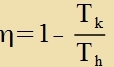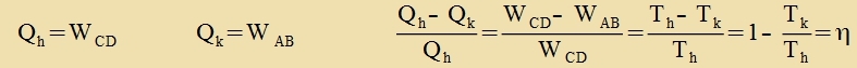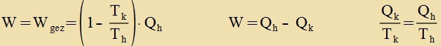 Venn ein Värmerezervoar Rh der Temperatur Th ctändig di Värmeenergi Qh an den Kreizprotsess lifert unt auf der anderen Zeite ein Rezervoar Rk der Temperatur Tk di Apvärme Qk aufnimmt, vird fortlaufend ein bectimmter Teil der Värmeenergi inn Arbeit (mexanice Energi) umgezetst. Dis ist di Funktsion eines Värmekraftverkes unt dessen Virkungsgrad η ist definirt als der Anteil der eingezetsten Värmeenergi, der inn Arbeit umgezetst vird. Bei einem idealen Carnotcen Kreizprotsess ist (nur mit Beträgen gerexnet) ![]()