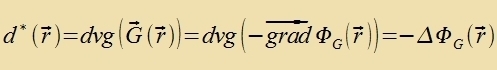 Imm Gravitatsionsfeld G(r) ist di Arbeit unaphengig fom Veg, das Gravitatsionsfeld ist rotatsionsfrei unt kann als Gradient einer Potentsialfunktsion ΦG(r) dargectellt verden. Di Kvellen des Gravitatsionsfelds zint Massen, di Kvellendixte d∗(r) ist bis auf eine Konstante gleix der Massendixte. Da der Gradient inn Rixtung der ctärksten Tsuname des Potentsials tseigt, virkt das Gravitatsionsfeld G(r) genau entgegengezetst.