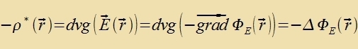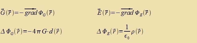 Aux imm elektricen Feld E(r) ist di Arbeit unaphengig fom Veg, E kann ebenfalls als Gradient einer skalaren Funktsion ΦE(r) dargectellt verden. Venn konventsionell inn Analogi tsur Gravitatsion der negative Gradient gevält vird, becreibt das Feld den Fall der Antsihung tsviccen elektricen Ladungen. Di Ladungsdixte ρ(r) unt damit aux di Kvelldixte ρ*(r) eines Feldes E, das eine pozitive Ladung q antsiht, muss daher negativ zein.
