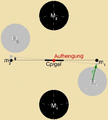 gedreht vird, dass di cveren Kugeln nahe bei den kleinen ruhen (inn der Skitse grau), dan virkt tsviccen inen di Kraft F(r)=m∙GM/r2 ((10) Kap. XVI).